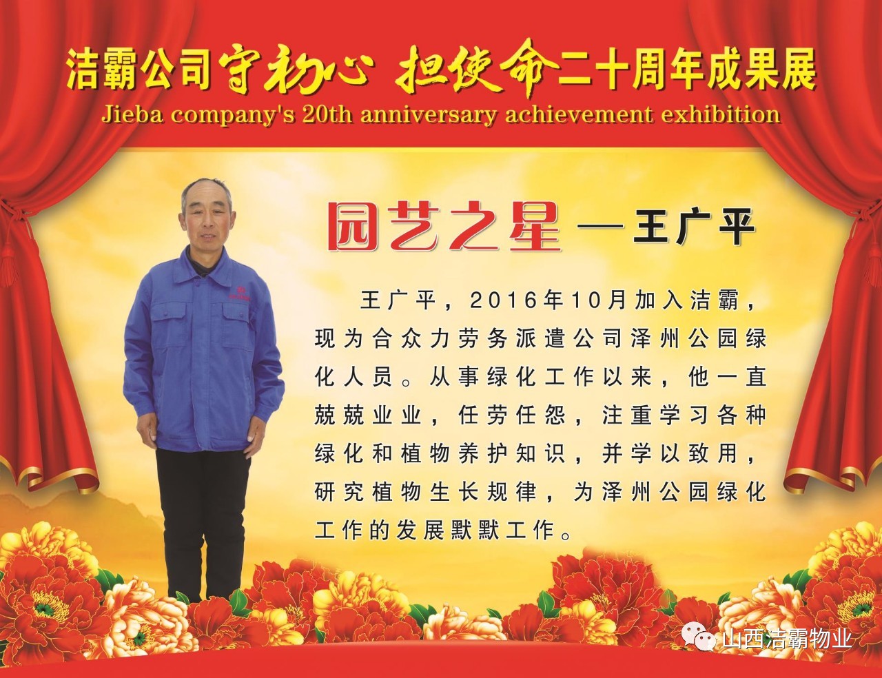 本次晚會以“潔霸二十華彰,感恩共創(chuàng)輝煌”為主題,此次慶典的核心思想是“感恩”,主要角色是潔霸的創(chuàng)業(yè)者。為此,公司對入職潔霸的創(chuàng)業(yè)功勛和一線員工進行了表彰獎勵。本次晚會共設8個獎項,包括“潔霸先鋒”“奉獻之星”“管理之星”“潔霸管家”“潔霸工匠”“清潔之星”“潔霸衛(wèi)士”“園藝之星”等。他們是:李山虎、張永智、史志霞、陳福林、王紅軍、余艷青、劉二丑、成艷粉、楊改梅、王書玲、張國榮、耿竹青、張粉霞、宋秋苗、陳先梅、張晉平、張偉山、趙瑞軍、王廣平、郭志云。晉城市原副市長成育廷、晉城市商務局原局長王新善、晉城市非公和社會組織工委書記郎軍芳、晉城市婦聯(lián)三級調(diào)研員李蓮菊、晉城市總工會商貿(mào)輕紡煙草服務業(yè)工會主席張玉濤、晉城市城區(qū)財政局局長翟明太等領導為他們頒獎。