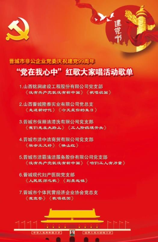 為了慶祝中國共產黨建黨99周年,6月28日,晉城市非公企業(yè)黨委在澤州天泰錦辰煤業(yè)有限公司組織開展了“黨在我心中”紅歌大家唱活動,潔霸清潔黨支部全體黨員及公司骨干參加演唱活動。