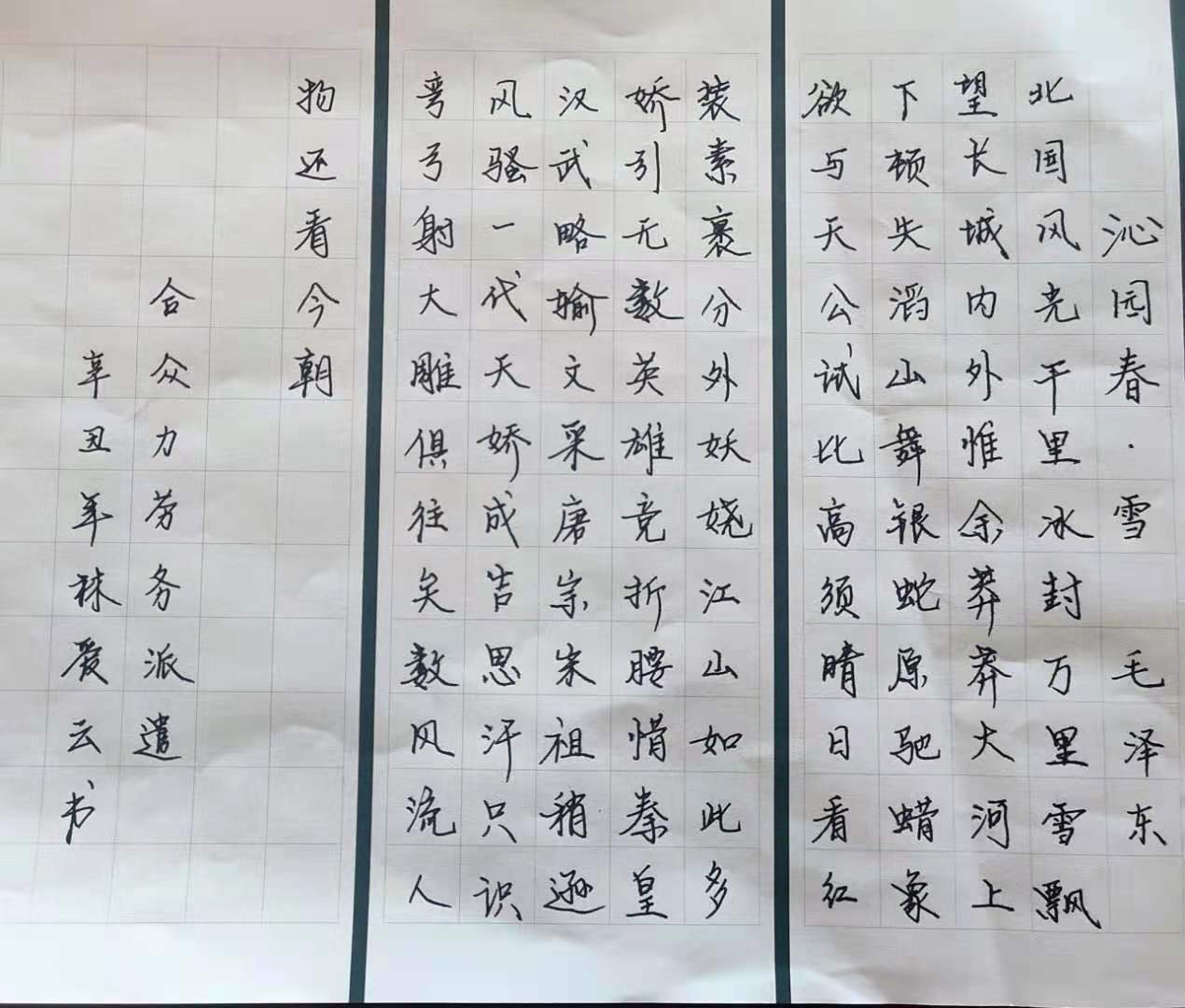 本次硬筆書法比賽活動圍繞“喜迎建黨百年華誕”主題,以摘抄歌頌黨、歌頌祖國、歌頌企業(yè)的詩詞、散文、歌賦等為書寫內(nèi)容,參賽選手個個滿懷激情,用心書寫每一個漢字,筆畫流暢,結(jié)構(gòu)勻稱,整體美觀,表現(xiàn)出良好的書寫功底。公司組織相關(guān)人員對參賽員工的作品進行客觀公正的評審,評選出一、二、三等獎若干名。