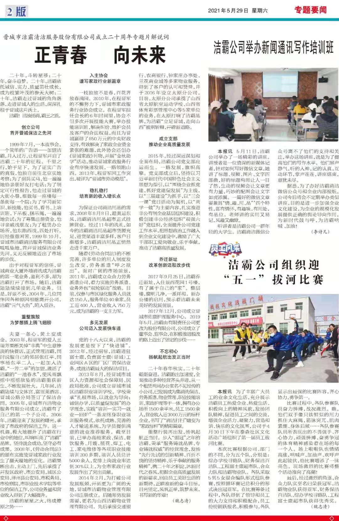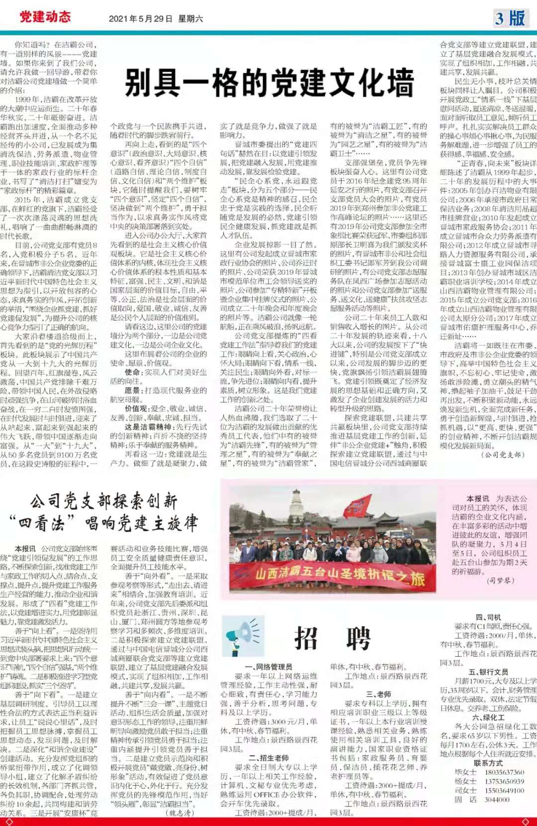 今天是2021年5月29日,經(jīng)過(guò)一個(gè)多月的緊張籌辦,《山西潔霸》報(bào)紙終于創(chuàng)刊啦!這是潔霸人的一件大喜事,也是潔霸人的驕傲!伴隨著《山西潔霸》紙質(zhì)版的內(nèi)部發(fā)行,電子版也同步與你見(jiàn)面了。希望你能通過(guò)這個(gè)宣傳窗口,更好地走近潔霸,了解潔霸,關(guān)注潔霸,支持潔霸。