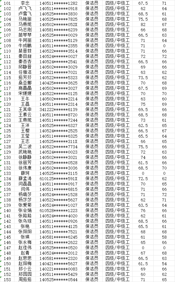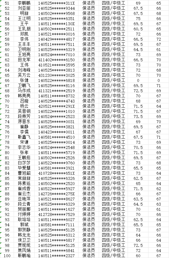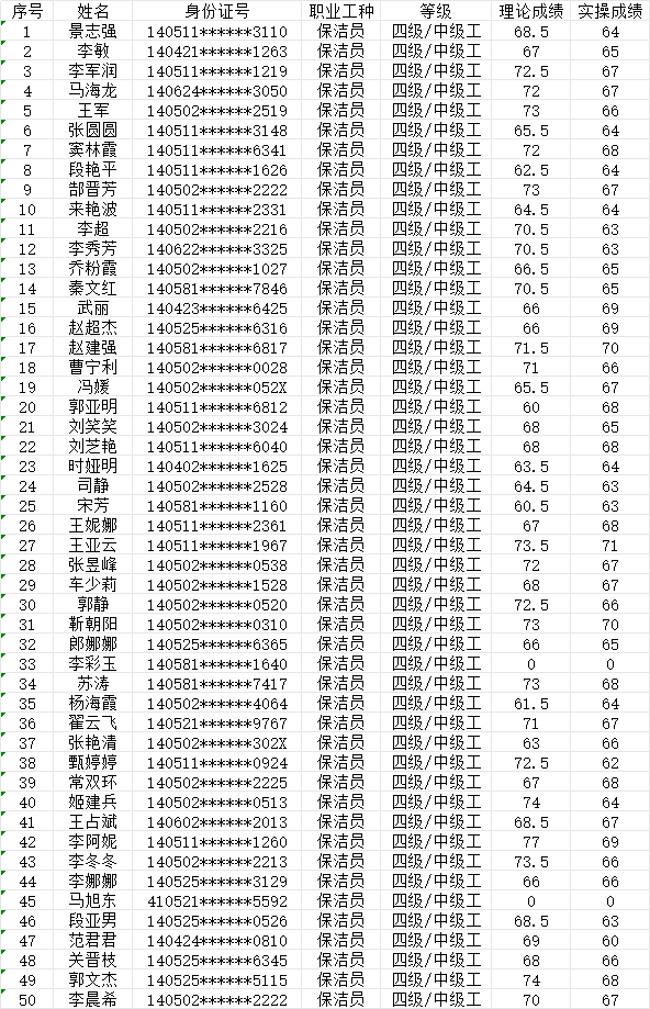 晉城市潔霸清潔服務股份有限公司職業(yè)技能等級認定中心2024年1月28日第7批保潔員中級認定人員成績公示