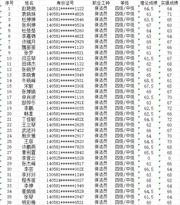 晉城市潔霸清潔服務(wù)股份有限公司職業(yè)技能等級(jí)認(rèn)定中心現(xiàn)將2024年5月23日認(rèn)定人員成績公示如下:
