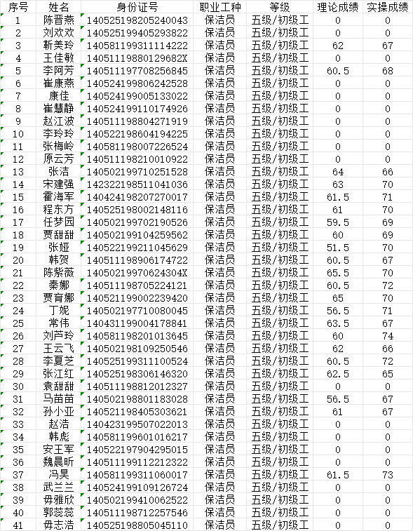 晉城市潔霸清潔服務(wù)股份有限公司職業(yè)技能等級認定中心2024年8月4日第27批保潔員初級認定人員成績公示